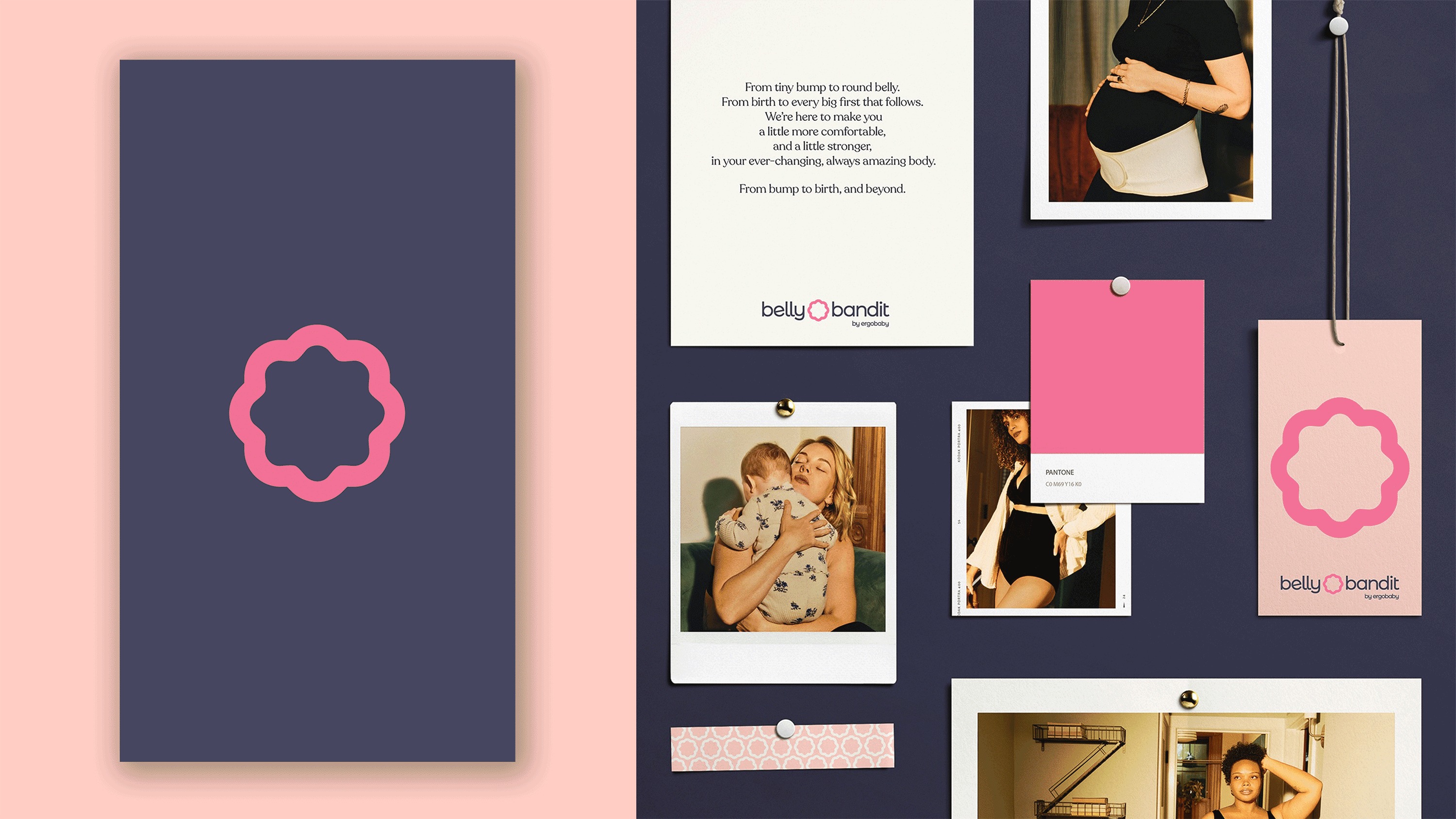 We created a strategic positioning of “Confident Encouragement,” the lens through which all brand elements and creative decisions were crafted. The role of the brand was attuned to an “inspiring mentor, trainer, or guide.” Belly Bandit provides not only the physical support, but also the mental and emotional support, resources, and knowledge to best equip her throughout the journey. Thus, the lower-case sans-serif logo and color palette of navy blues, peaches, and restrained pops of bright pink are inviting yet professional; approachable yet credible; conversational, yet dependable. The photography and film provide “Confident Encouragement” by showcasing diverse and beautiful bodies against a backdrop of warm and cinematic lighting. And the copywriting flexes to express levity, tenderness, and strength, because “Confident Encouragement” calls for different emotions to be pushed and pulled at just the right times.